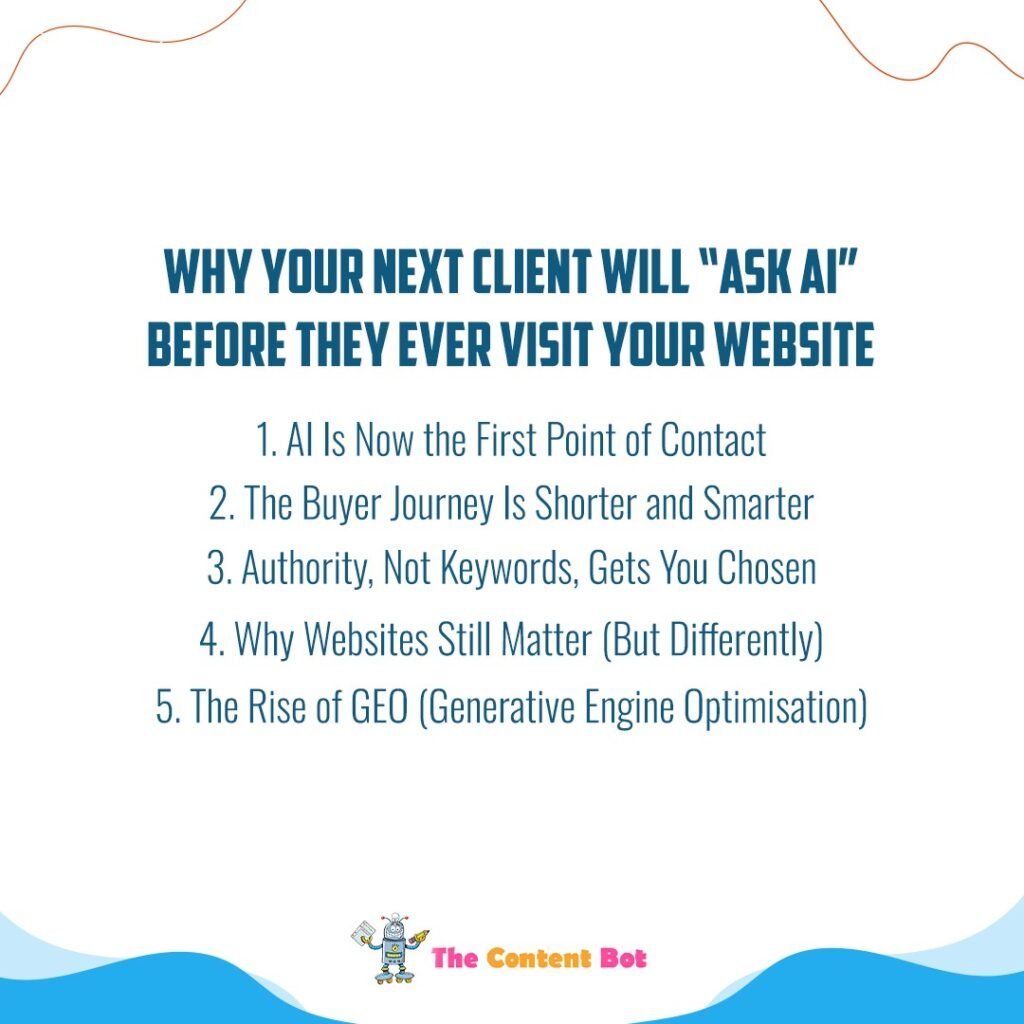 Your next client won’t find you through your homepage they’ll find you in an AI-generated answer. By the time they visit your site, they’re already 70% decided. The brands that adapt now will own this new buyer journey. At The Content Bot, we help businesses shift to an AI-first strategy, ensuring you’re visible, trusted, and chosen before your competitors even enter the conversation.