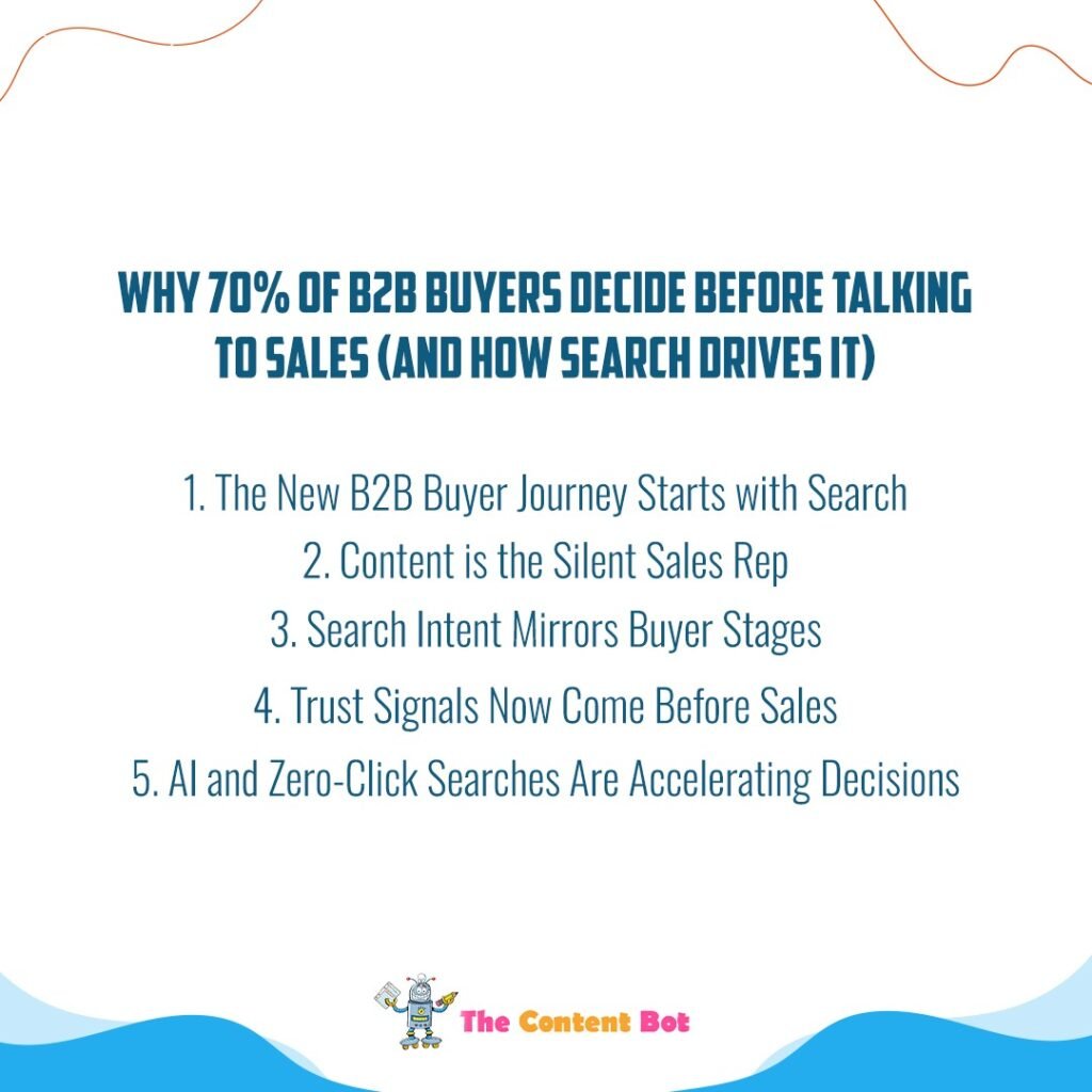 B2B buyers don’t wait for sales anymore. They make 70% of their decision through research, reviews, and search long before they speak to you. The brands that win in 2025 are the ones that align content with buyer intent, optimise for AI-driven search, and build trust online. At The Content Bot, we help businesses shift from chasing buyers to guiding them so when sales finally steps in, the decision is already in your favor.