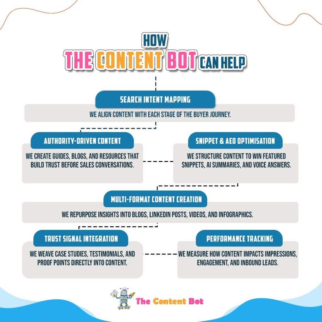 At The Content Bot, we help B2B brands influence buying decisions earlier by building search-driven content ecosystems. Here’s how: