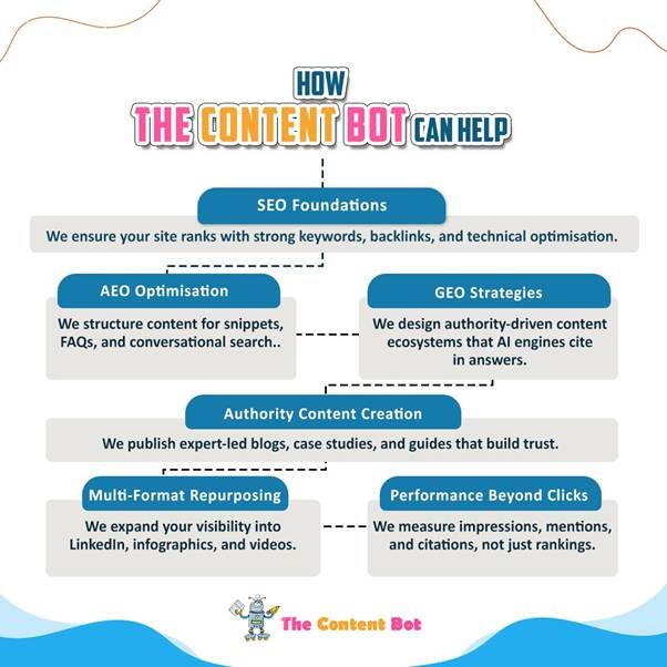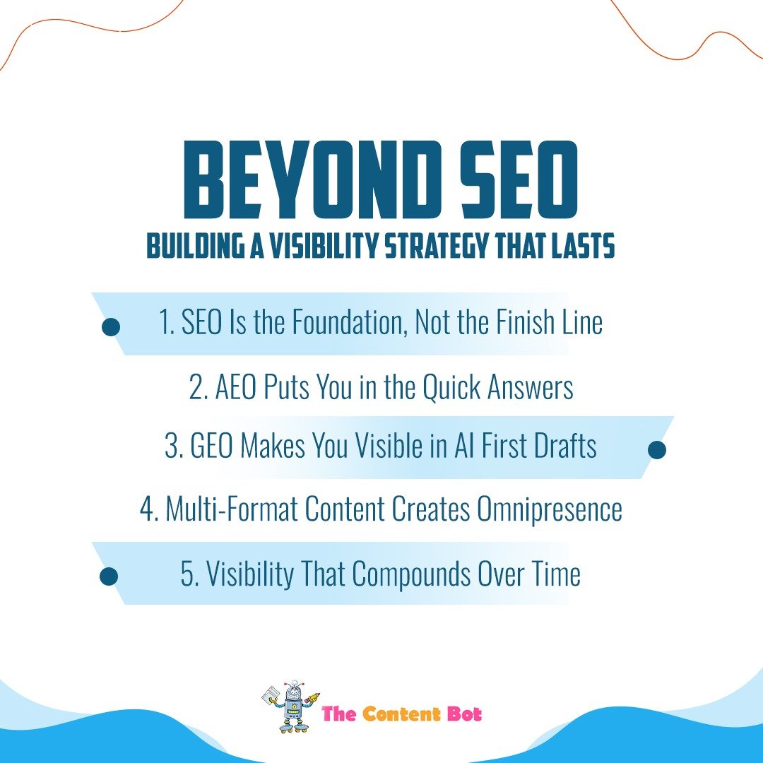 SEO is still critical but it’s no longer enough. In the AI era, businesses must layer SEO with AEO and GEO, while building authority and multi-format visibility. This is how you stay relevant, credible, and discoverable long-term. At The Content Bot, we design visibility strategies that don’t just win rankings they build trust that lasts.
