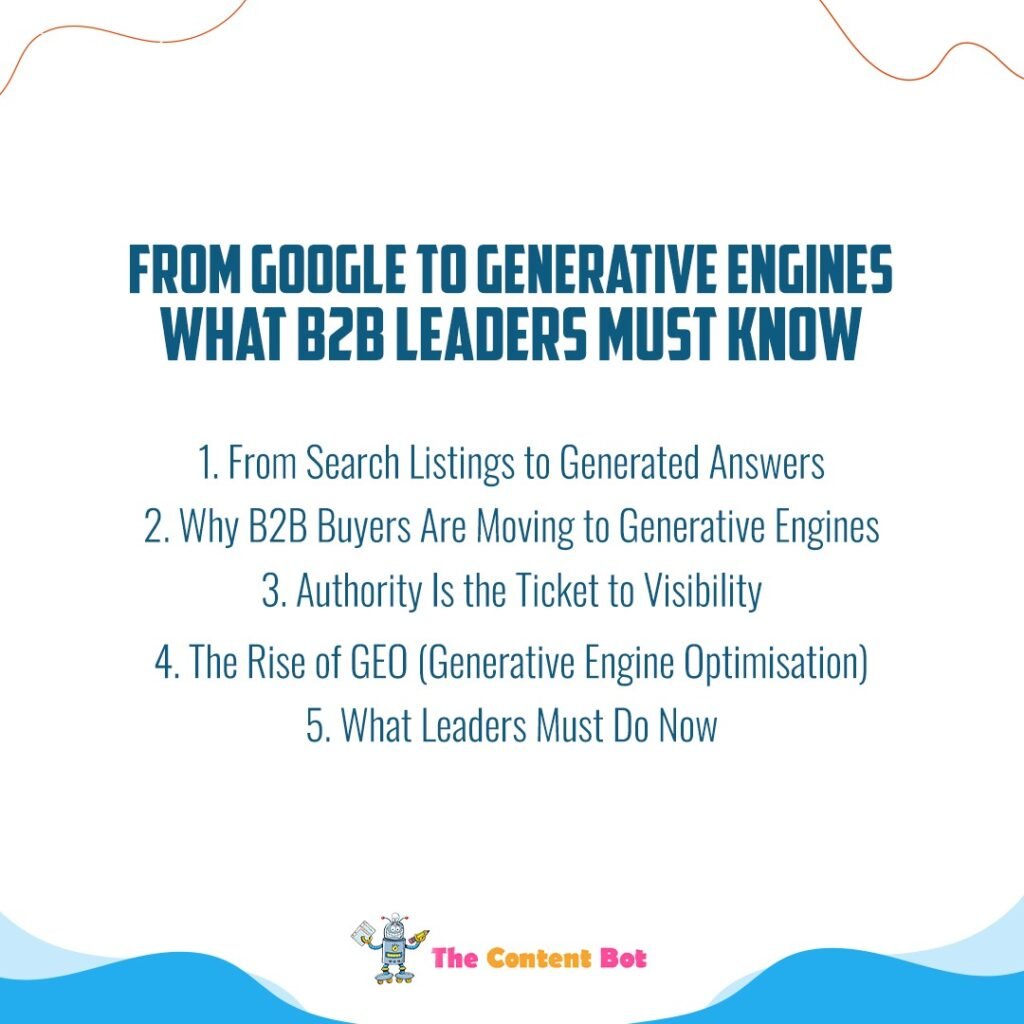 The buyer journey is moving beyond Google into generative engines that deliver answers instantly. For B2B leaders, this shift changes the rules of visibility and trust. Those who invest in GEO now will shape the first impression buyers see. At The Content Bot, we help businesses future-proof their marketing so they don’t just rank they lead in the era of AI-powered discovery.