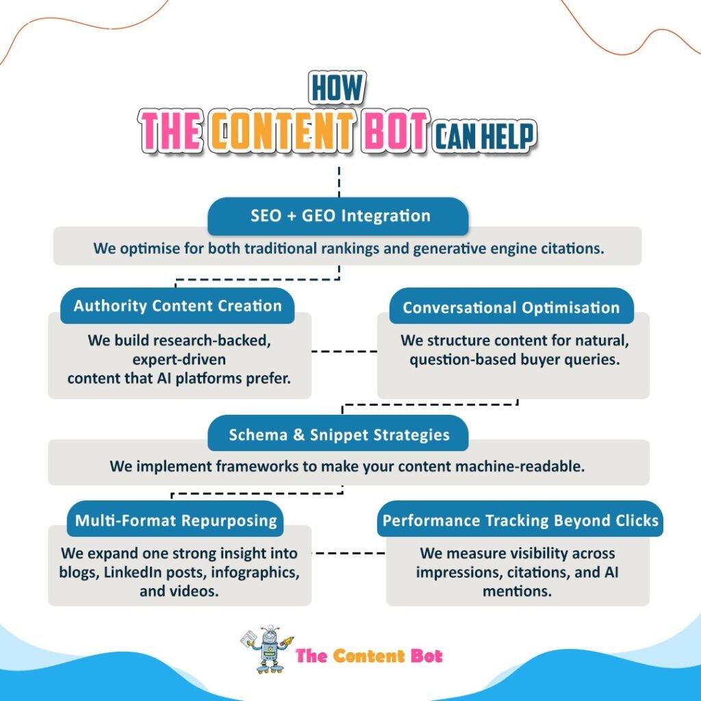 At The Content Bot, we help B2B leaders navigate the shift from Google to generative engines with AI-ready visibility strategies. Here’s how we do it: