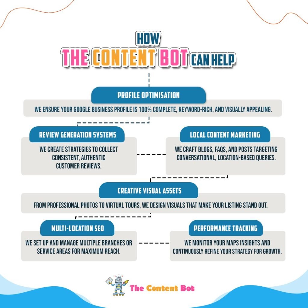 At The Content Bot, we specialise in optimising local businesses for discovery and conversion. Here’s how we help you make the most of Google Maps: