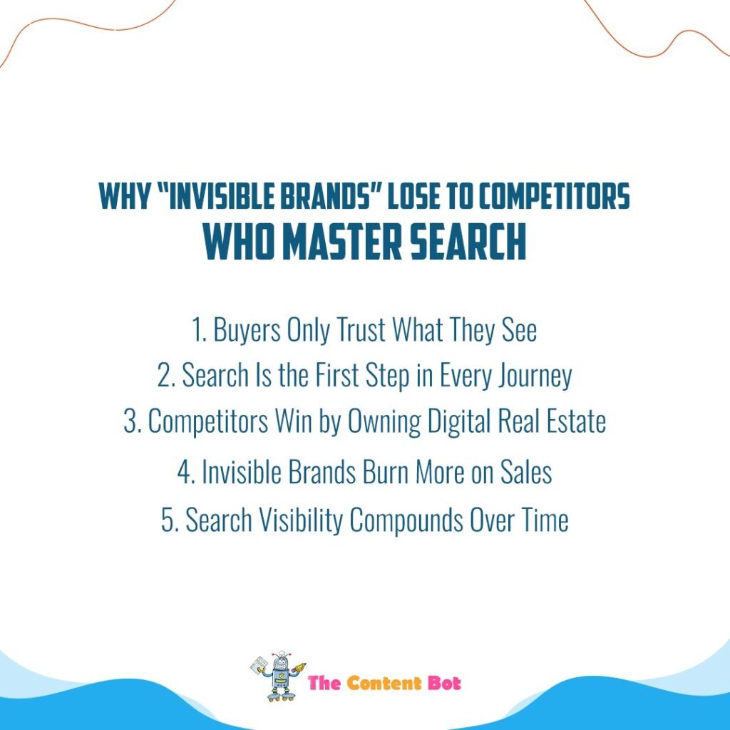 In B2B, invisibility is the fastest way to lose. Buyers don’t wait for cold calls they search, they ask AI, and they trust the brands they see. Competitors who master search capture that trust and those deals. At The Content Bot, we help businesses escape invisibility and build credibility through search-driven strategies that win attention and trust before the first pitch.