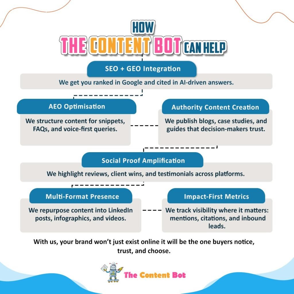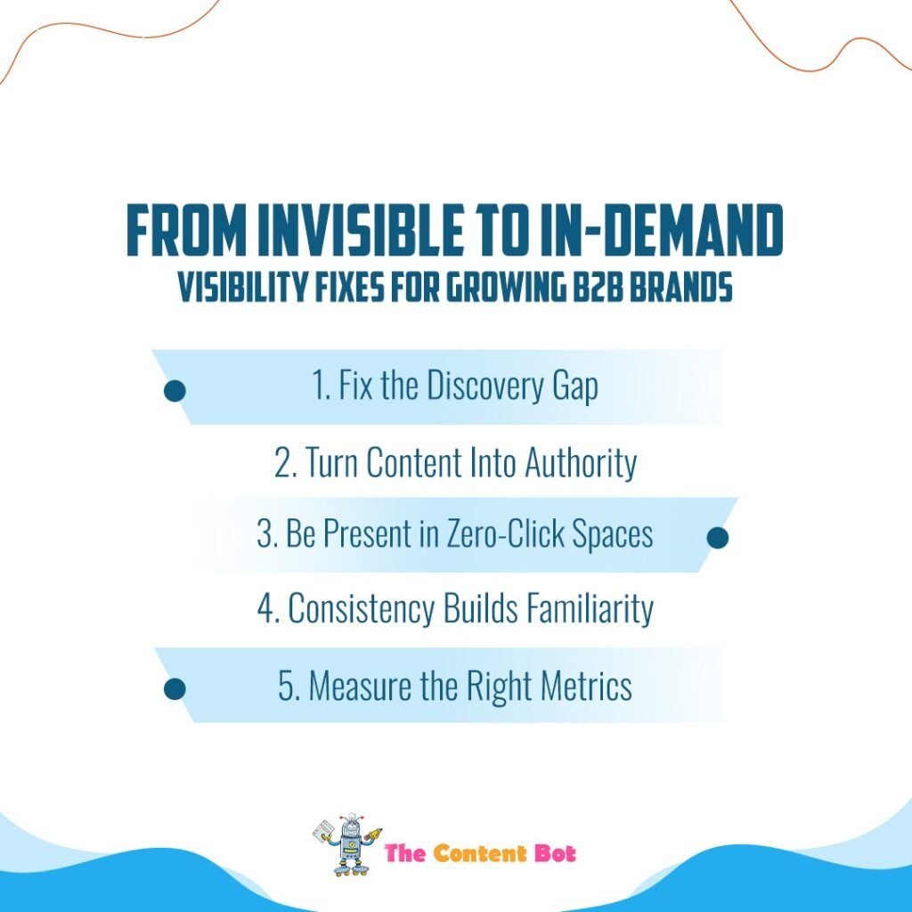 At The Content Bot, we help B2B companies move from invisible to in-demand by fixing the gaps that block visibility. Here’s how: