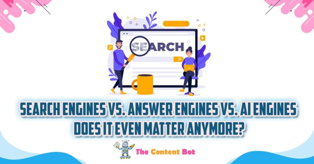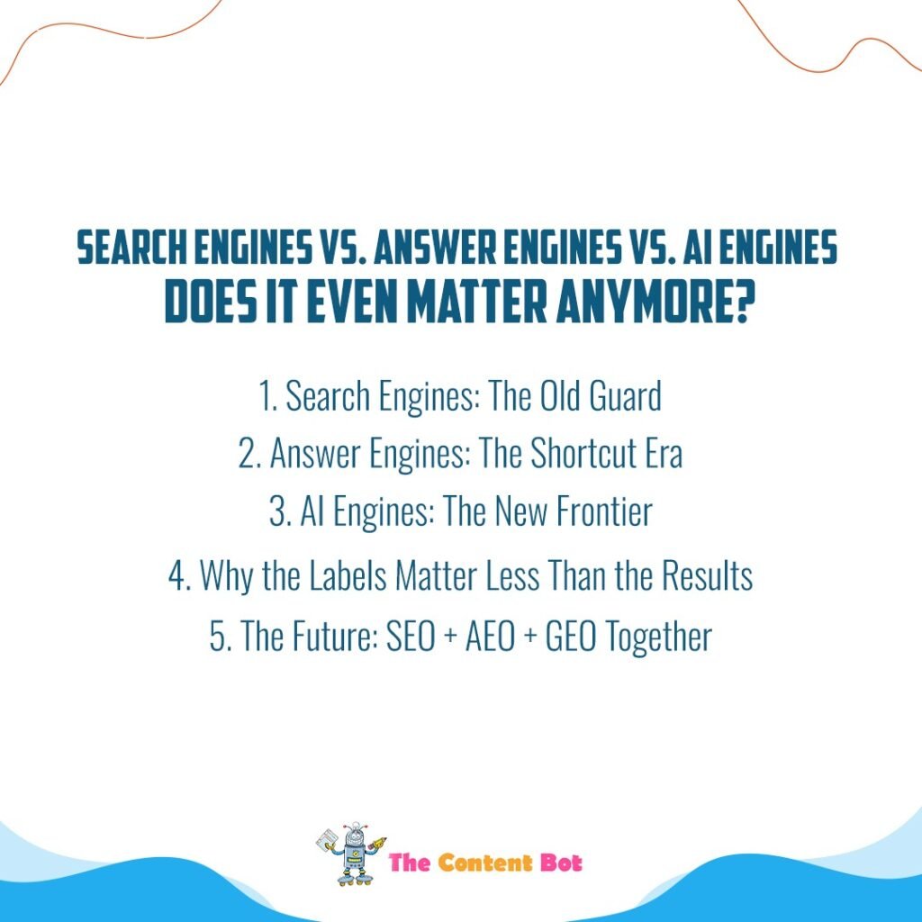 In 2025, arguing about search vs. answer vs. AI engines misses the point. Buyers don’t care what it’s called they care about finding trustworthy answers fast. For businesses, the only question is: are you visible where it matters? At The Content Bot, we help brands master SEO, AEO, and GEO so no matter how buyers search, your brand is the answer they find.