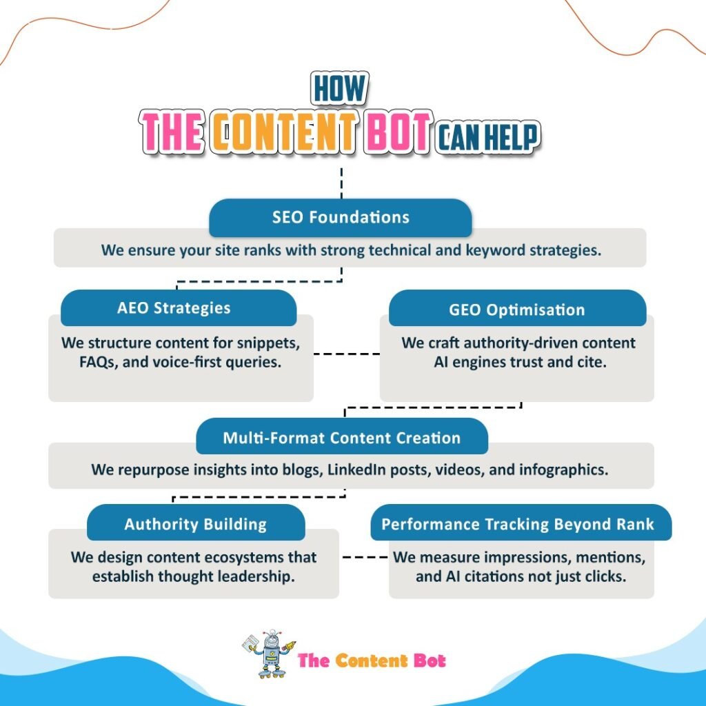 At The Content Bot, we help businesses future-proof their visibility by mastering SEO, AEO, and GEO together. Here’s how: