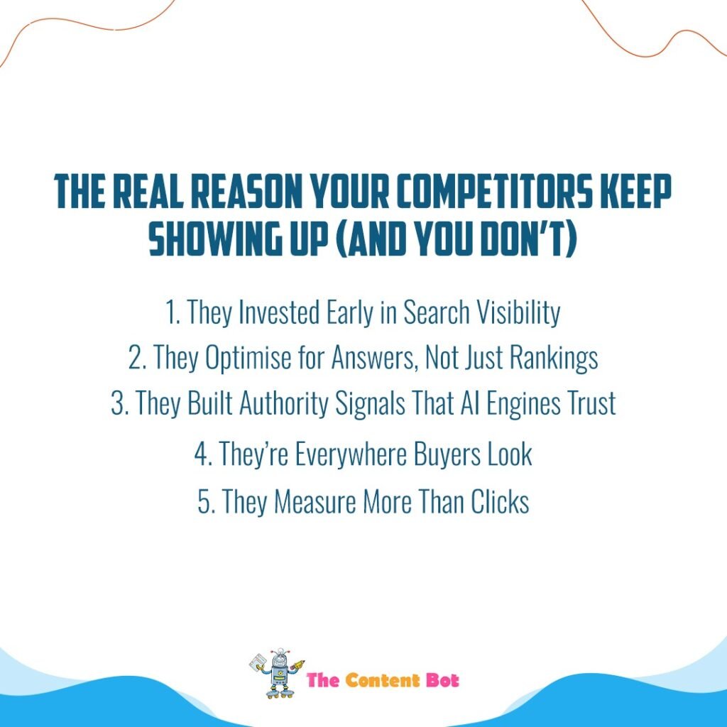 Your competitors don’t keep showing up because they’re lucky they show up because they’ve invested in visibility strategies you haven’t. Ranking is no longer enough; authority, AI readiness, and omnichannel presence are the real drivers. At The Content Bot, we help businesses break out of invisibility and own the buyer’s attention before competitors do.